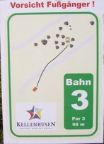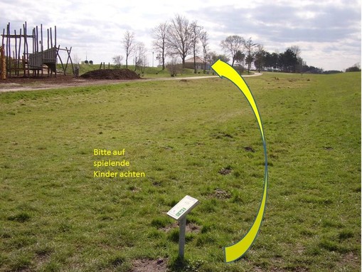 Diese Bahn kann auf geradem Wege gespielt werden. Vorsicht, vor dem Korb steht eine Buschreihe. Bei Turnieren wird der Weg zum OB (Flatterband).