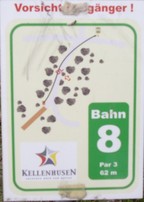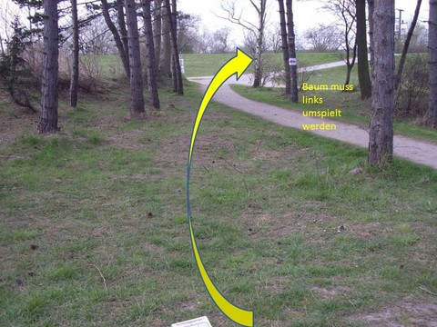 Dieses ist eine Rechtsbahn, der Korb steht rechts hinter dem Wäldchen. Der Baum in der Mitte (mit rotem Pfeil) markiert, muss links umspielt werden, "DL" ansonsten